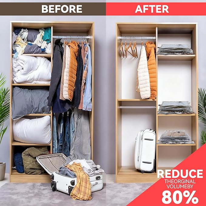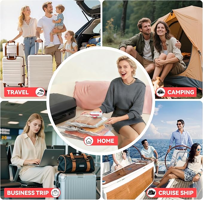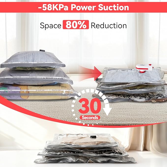 - USB and TYPE C Powered Vacuum Pump:-58KPa suction Save Up to 80% of Space, it compresses each bag in 10-15 seconds, completing a full set in under 3 minutes for efficient packing,allowing you to carry more things when traveling.USB charging via laptop or power bank ensures global compatibilit.