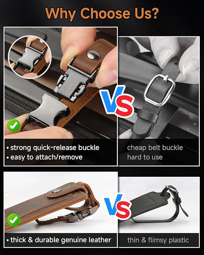 - Effortless Install: Innovative quick side release buckle allows instant attachment and removal of the luggage tag from your luggage handle or strap – skip the struggle of threading leather straps!