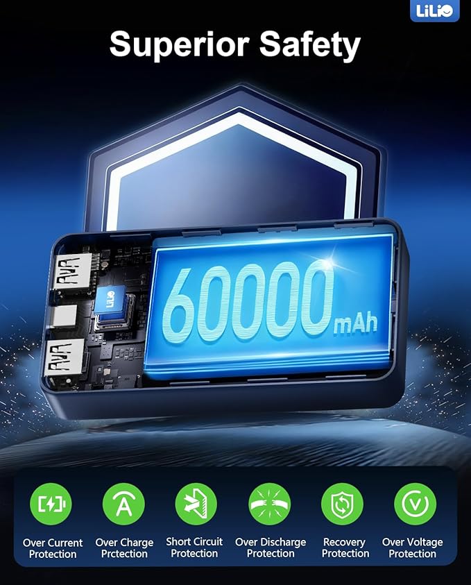 - Massive 60,000mAh Capacity & Smart Display: Experience unprecedented power with our 60,000mAh portable charger, engineered for over 100 charge cycles while retaining 80% capacity. The integrated smart LED display shows the exact remaining power down to 1%, eliminating guesswork. It serves as a reliable emergency power source during blackouts or natural disasters like earthquakes, ensuring you're always prepared and connected, even without a wall charger.