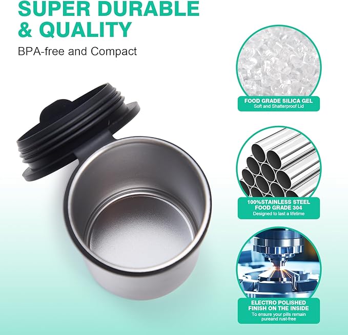 - STURDY & DURABLE;100% leakproof protection. Crafted from medical-grade 304 stainless steel with food-grade liquid silicone edges, this pill case survives drops and shakes while keeping medications secure.