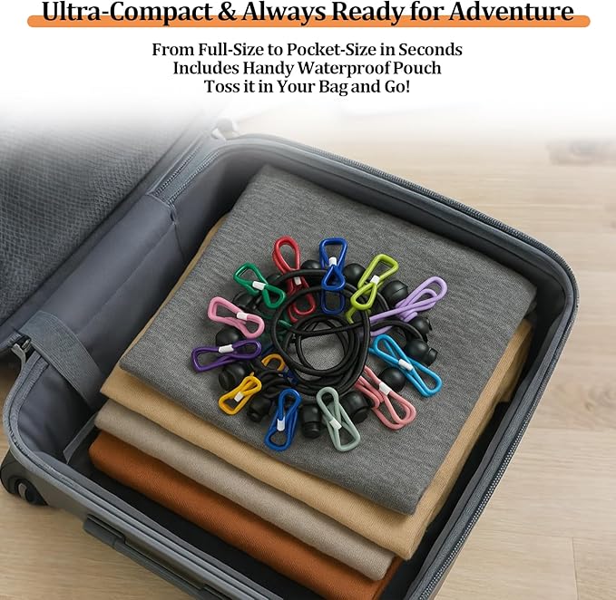 - LIGHTWEIGHT & TRAVEL-READY: Designed for the savvy traveler and outdoor enthusiast. This lightweight camping clothesline folds down into a tiny, compact pouch that fits in the palm of your hand. Toss it in your suitcase, backpack, or glove box for instant laundry convenience on the go.