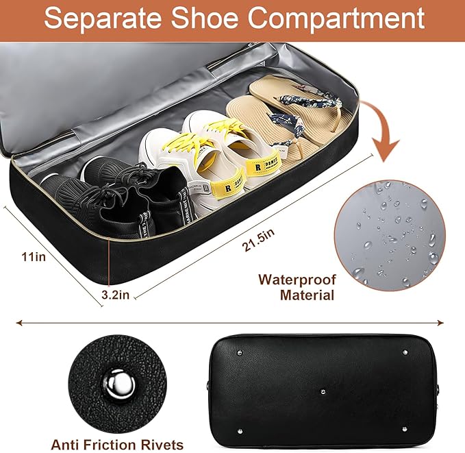 • WATERPROOF SHOE COMPARTMENT & DIRTY LAUNDRY ISOLATION: Features a dedicated PVC-lined compartment (21"L×11"W×3.2"H) storing up to 3 shoe pairs or isolating wet/dirty items. Thickened base enhances weight support and durability.