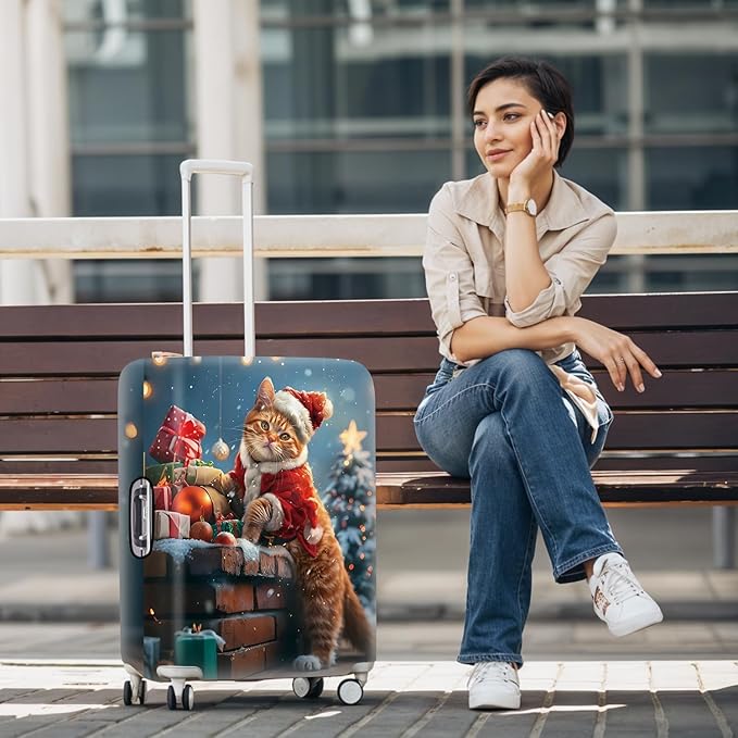 Christmas Cat Luggage Cover – Cute Santa Kitty Suitcase Protector, Holiday Travel Luggage Sleeve, Stretchable & Waterproof,M