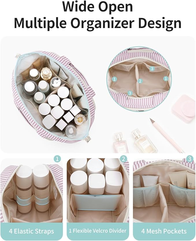 Narwey Travel Toiletry Bag, Wide-open Large Toiletry Bags for Traveling Women, Checkered Travel Bag for Toiletries Cosmetic Makeup Bag Organizer, Skincare Make Up Bag (Dusty Pink Stripe)