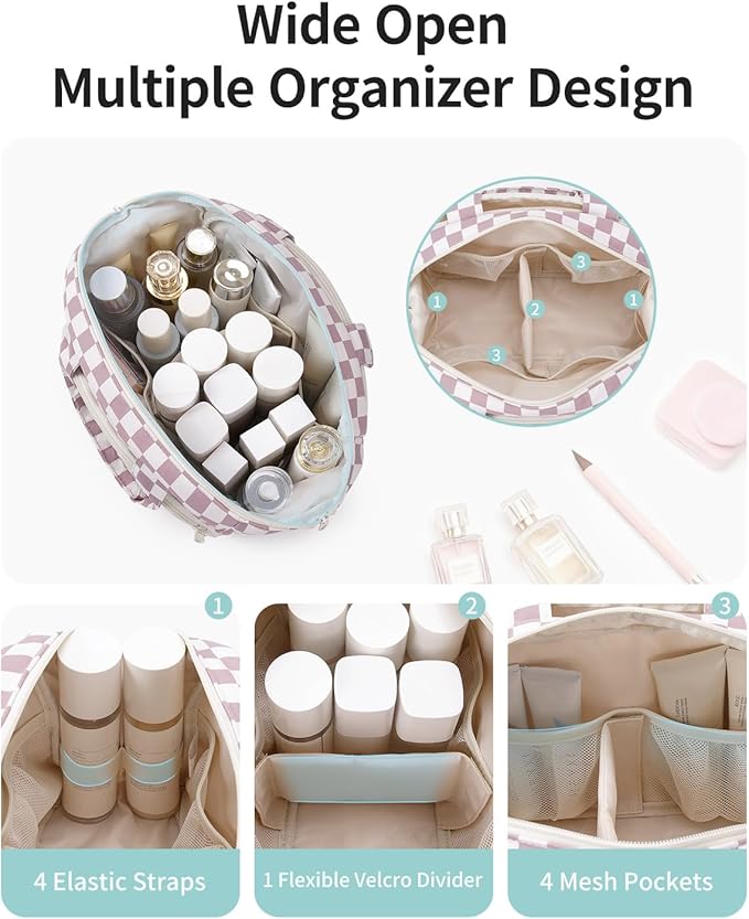 Narwey Travel Toiletry Bag, Wide-open Large Toiletry Bags for Traveling Women, Checkered Travel Bag for Toiletries Cosmetic Makeup Bag Organizer, Skincare Make Up Bag (Dusty Pink Checkerboard)