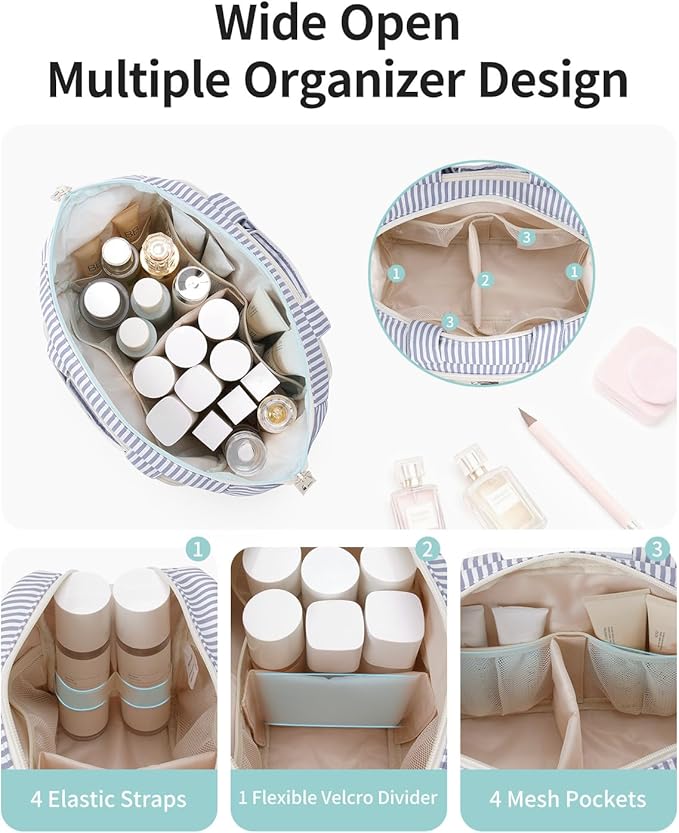 Narwey Travel Toiletry Bag, Wide-open Large Toiletry Bags for Traveling Women, Checkered Travel Bag for Toiletries Cosmetic Makeup Bag Organizer, Skincare Make Up Bag (Greyish Blue Stripe)