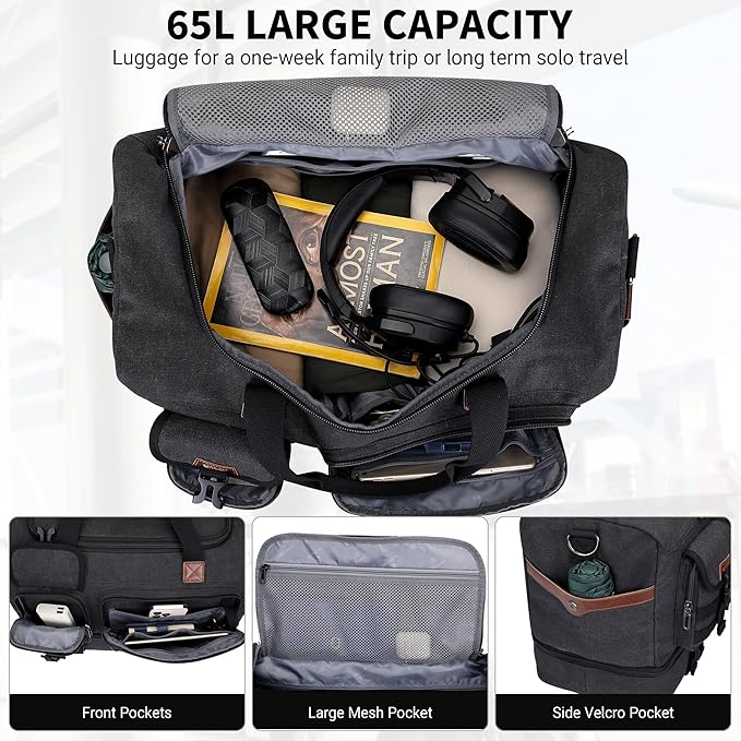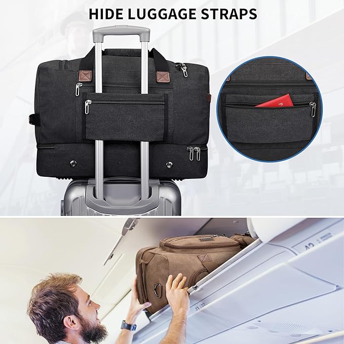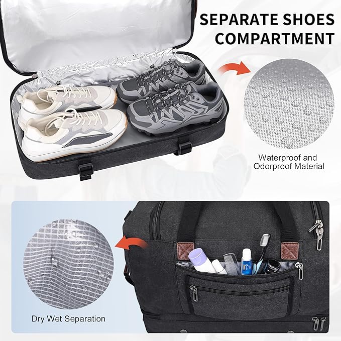 WITZMAN Duffle Bag for Men 50L Canvas Weekender Overnight Bag with Toiletry Bag Sets Travel Duffel Bag Shoes Compartment(A8010-2 Classic Black)
