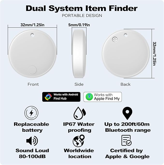 - ✅【Android & iOS Compatible】These smart tags work with both Google Find My Device (Find Hub) and Apple Find My, making it suitable with Android and iOS devices. (iOS 14.5 or later, Android 9.0 or later) You may easily pair it with your smartphone to track your belongings at any time. No third-party apps or subscription costs. (Notes: Cannot connect to iPhone and Android at the same time. Not compatible with Huawei smartphones.)