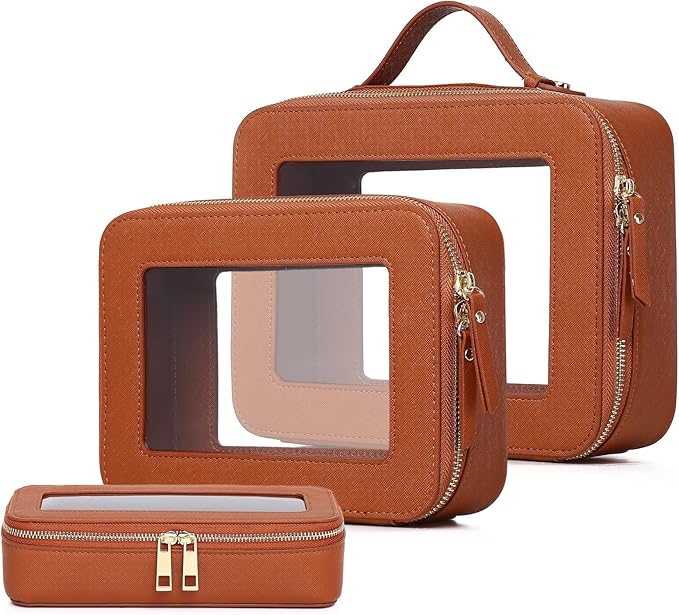 Pinkmik Clear Makeup Bag with Brush Bag 3pcs Waterproof Travel Case for Cosmetics and Toiletries Women's Makeup Organizer with Zipper (X/Brown, L+M+SLIM)