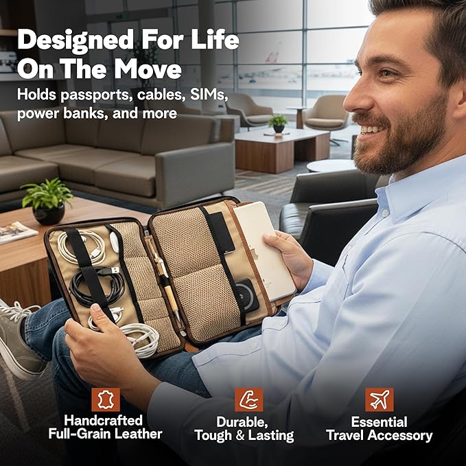 - PREMIUM LEATHER, TRAVEL-TOUGH BUILD – A sleek leather tech organizer that looks boardroom-ready and works road-ready. The durable leather exterior and padded walls protect your electronics accessories, cords, chargers, mouse, power bank, and daily tech essentials on every trip.