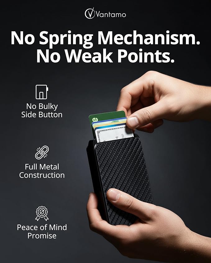 - No-spring mechanism, no durability issues! Our unique no-spring system means smoother operation and less wear. This credit card holder is built to outlast trends, giving you a really lasting men wallet. No matter what outfit was chosen, our slim wallet for men will fit perfectly into any pocket without adding bulk.