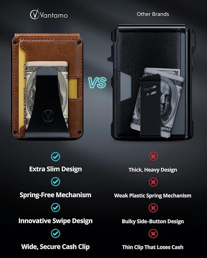 - Built to last, crafted to impress! Vantamo brown wallet is designed from premium materials that stand up to daily use. Every thin wallet for men slim features sturdy stitching and elegant texture, making it a stylish and durable wallet with clip you’ll love carrying.