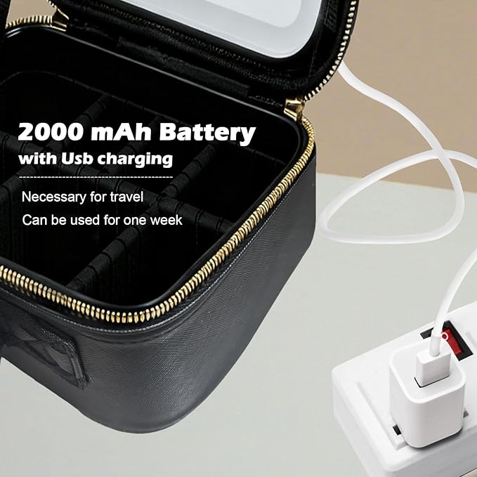 - 【LED Light 3 Adjustable Brightness Cosmetic Bag】The makeup bag with lights is equipped with a detachable lighted vanity mirror, The makeup mirror bracket tilt angle can be 30°, 60°, 90° which is convenient for your makeup needs from various angles. 2000 mAh more efficient battery ensures 8 days of continuous use, the included Type-C cable, and it can be fully charged in about 2 hours. Touch switch adjusts cool, natural, warm light, revealing true skin and facial details, Confidently face any makeup scenario.