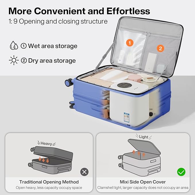 - 【Creative Side-Opening Design】Say goodbye to traditional and heavy clamshell luggage. Mixi luggage adopts an innovative 1:9 side-opening design, which is more convenient and labor-saving. You can open it in any crowded place and easily access your items
