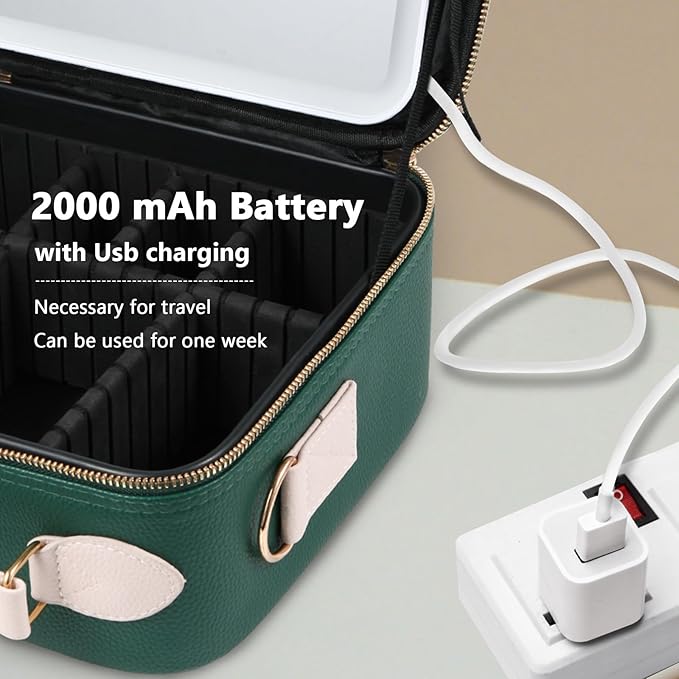 Travel Makeup Bag with Light Up Mirror, Portable Makeup Bag with Led Light Women Waterproof Makeup Travel Case adjustable dividers Rechargeable Vanity Mirror with 3 Color Lights (Green)