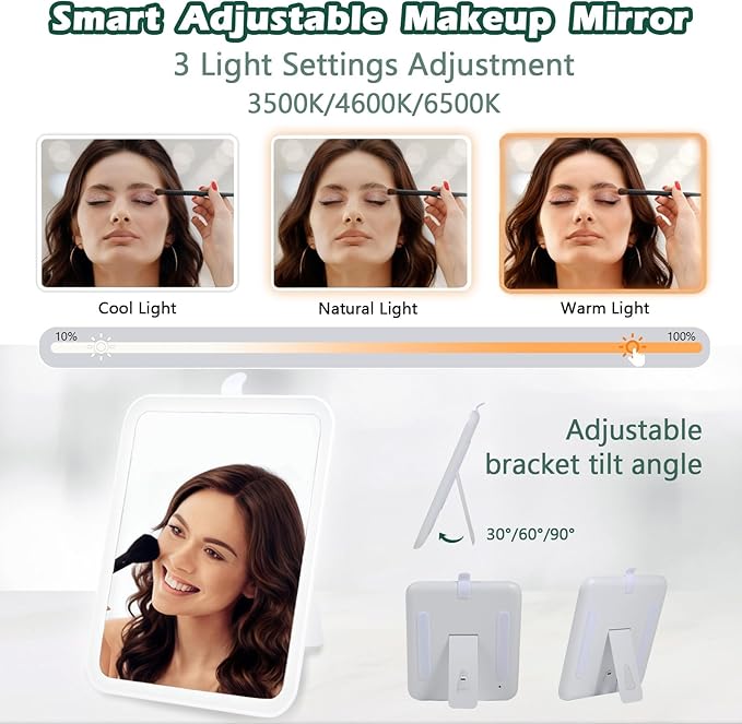- 【LED Light 3 Adjustable Brightness Cosmetic Bag】The makeup bag with lights is equipped with a detachable lighted vanity mirror, The makeup mirror bracket tilt angle can be 30°, 60°, 90° which is convenient for your makeup needs from various angles. 2000 mAh more efficient battery ensures 8 days of continuous use, the included Type-C cable, and it can be fully charged in about 2 hours. Touch switch adjusts cool, natural, warm light, revealing true skin and facial details, Confidently face any makeup scenario.