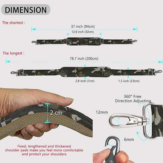 ZINZ 79 inch Shoulder Strap, Extra-thick Fixed Cushion Pad and Dual Clasps Universal Replacement Strap with Metal Swivel Hooks for Laptop Bags, Luggage Bags, Camera, Crossbody(Camouflage Green)