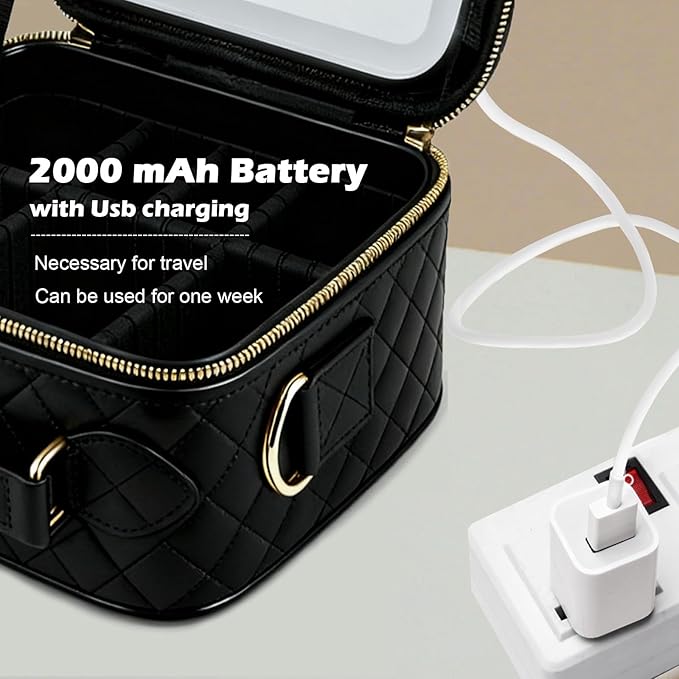 - 【LED Light 3 Adjustable Brightness Cosmetic Bag】The makeup bag with lights is equipped with a detachable lighted vanity mirror, The makeup mirror bracket tilt angle can be 30°, 60°, 90° which is convenient for your makeup needs from various angles. 2000 mAh more efficient battery ensures 8 days of continuous use, the included Type-C cable, and it can be fully charged in about 2 hours. Touch switch adjusts cool, natural, warm light, revealing true skin and facial details, Confidently face any makeup scenario.