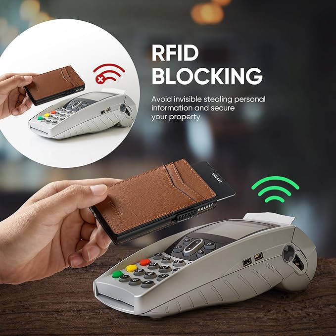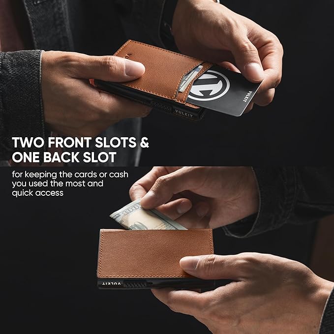 VULKIT Men's Slim Wallet Pop Up Card Holder RFID Blocking Metal Wallet Minimalist Design Holds Up to 11 Cards, Nappa Leather