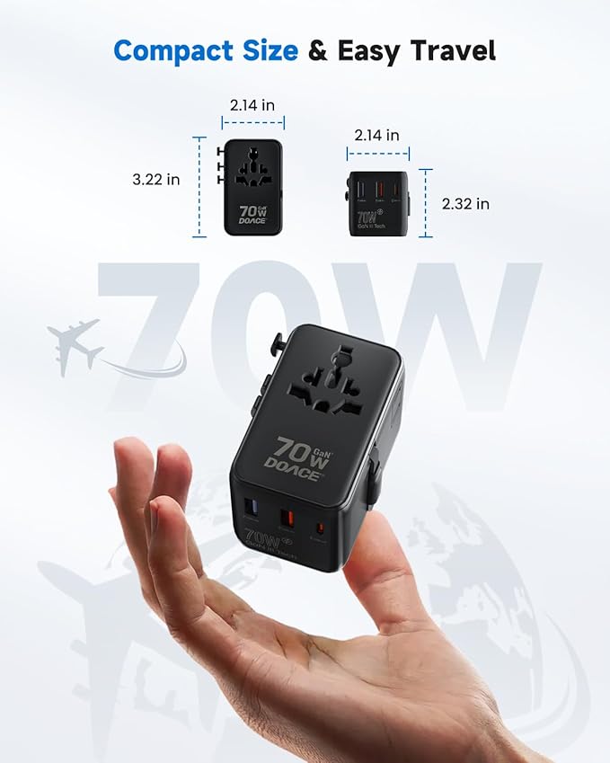 DOACE Travel Adapter 70W GaN 3.0, European Travel Plug Adapter with Built-in USB-C Cable, 6 in 1 International Power Adapter USB-C PD Fast Charging for EU/UK/USA/AUS