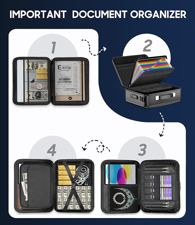 - Upgraded Stylish Hard-Shell Design: The upgraded hard-shell document organizer breaks through traditional limits by integrating a high-strength hard shell structure with professional fireproof materials. Compared with conventional soft file box, this upgraded design withstands extreme environmental impacts while maintaining an elegant & professional appearance through its dust-proof & stain-resistant surface. Wise choice for your important documents, laptop, and valuables.