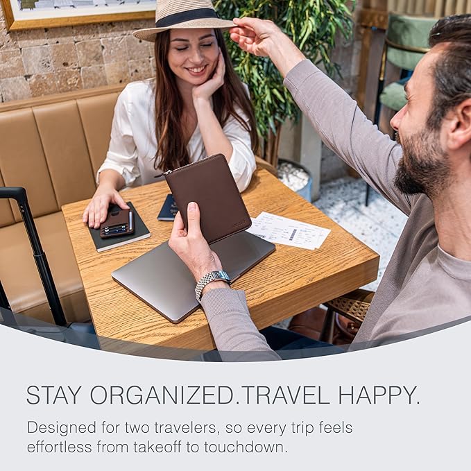 - Compact & Travel-Ready: Measuring 5.1in wide x 6.3in tall, this passport wallet for men and women is the perfect size for two travelers. This couple’s passport holder holds exactly what you need without being too large. Compact and organized, it travels well, sliding easily into your carry-on, backpack, purse, or hotel safe.