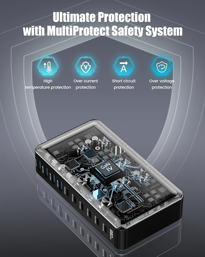 - 【Ultra-Powerful 880W Charging Station】Experience the convenience of high-speed charging for eight devices simultaneously with our potent 530W USB C Charger. Our USB C charger block with 5 USB-C ports and 5 USB-A ports, Streamlining your charging process, allowing you to power up all your devices simultaneously with ease. When a single device is connected to the USB-C1/C2 ports, it enjoys an impressive charge of up to 100W.