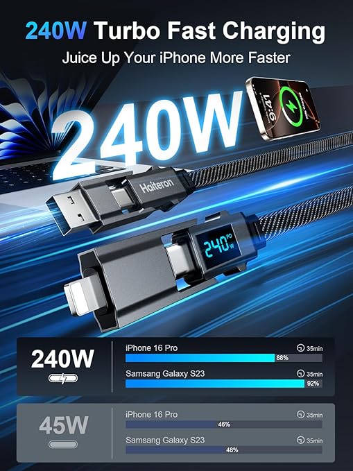 - [The Complete Package: Reliable Cable & Haiteron Support] You get one 3-foot (1m) Haiteron 240W 4-in-1 Charging Cable โ the perfect versatile length. Plus, enjoy the confidence of Haiteron's reliable 24/7 customer support. Got questions or issues? Contact us anytime, and we'll respond within 24 hours to make it right.