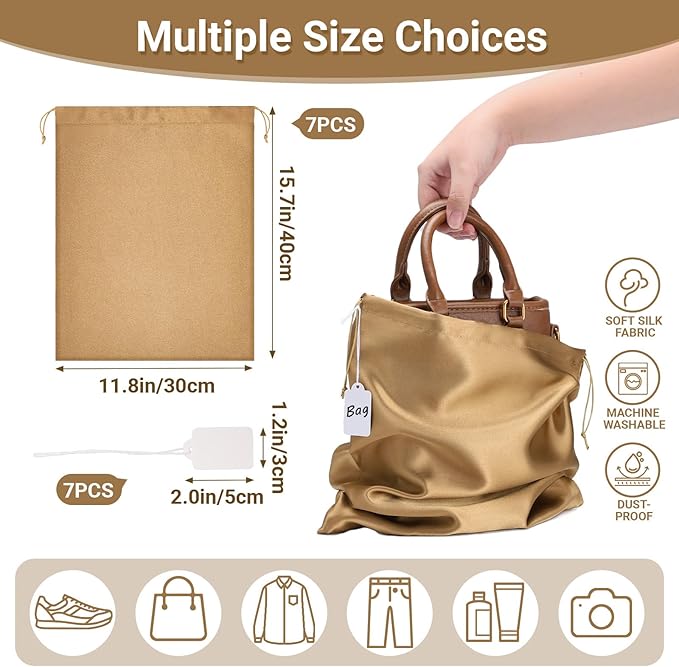 Ewen 7 Pack Satin Drawstring Bags Dustproof, 11.8x15.7in Small Dustbags for Handbags Shoes Storage with Blank Tags, Travel Essentials Packing Bag Purse Organizers for Closet Home Jewelry Organization