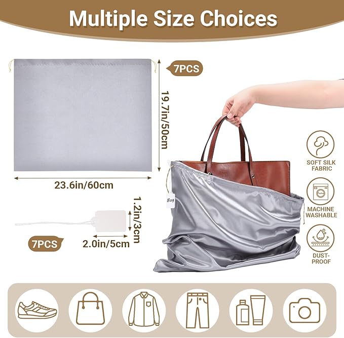Ewen 7 Pack Satin Shoe Bags Dustproof, 23.6x19.6in Dust Bags for Handbags with Drawstring, Large Travel Essentials Packing Bag, Purse Organizer with Blank Tags for Closet Storage Jewelry Organization