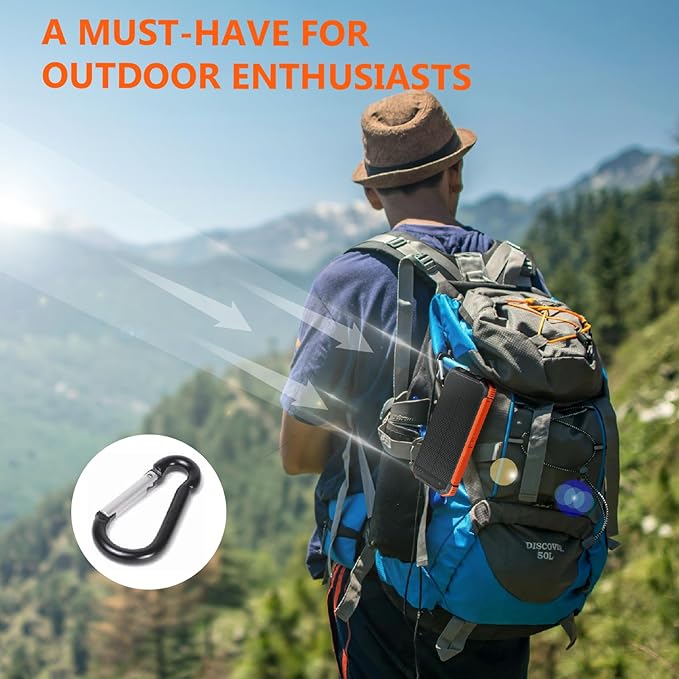 - 【Emergency Survival Kit】: 3-mode LED torch (steady/flashing/rescue). 20000mAh capacity can charge iPhone 15 up to 4.3 times, 5.5V/300mA high efficiency solar panel with overheat protection (>50°C/122°F auto shut-off) and extreme temperature tolerance (-20°C~60°C). 30 seconds no operation auto shut-off to save power consumption. The device is designed with a mountaineering buckle to keep you safe. Comes with a mountaineering buckle to make your outdoor travelling worry-free.