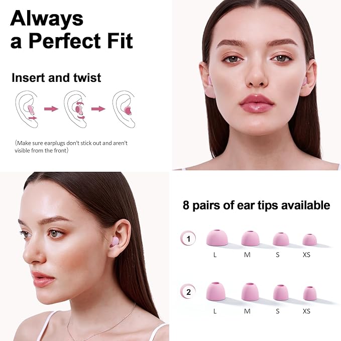 - All-Day Comfort: Ear plugs feature an ergonomic design that ensures a snug fit with a simple insertion and twist. Crafted from soft silicone, they provide comfort and pressure-free experience. Whether worn overnight for sleep or used for extended periods in noisy environments, without causing discomfort or irritation. Sleep ear plugs come with four sizes of ear tips: XS to L, you can easily find the perfect fit. Concert ear plugs strike a perfect balance between comfort and effectiveness.