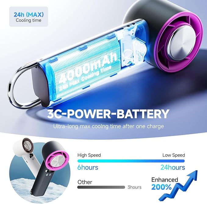 - [Ultra-Long Cooling Time] - The combination of brushless motor and a 4000mAh battery. It can cool for 24 hours time on a single charge. Besides, Significantly improves the wind speed, power, and endurance. The highest rotation speed of the handheld fan is 2.5 times that of a regular personal fan, reaching up to 15000 RPM.