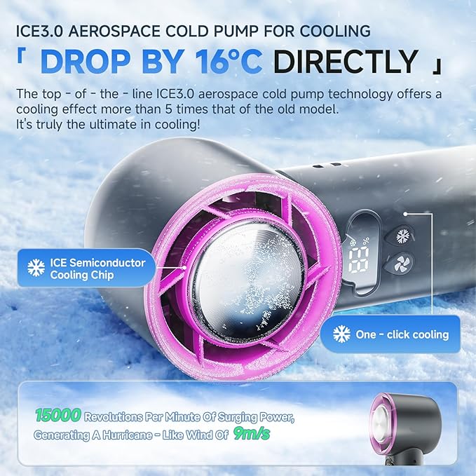- [Newest Highly Speed Handheld Fan] - Made with turbo, improve 50% speed. 1-100 speed adjustment, 2000-15000 RPM, maximum wind speed of 9m/s. Besides, equipped with a built-in semiconductor cooling chip, the cooling plate temperature can drop sharply to 21 ℃ within 30 seconds. And the appearance and weight have also been upgraded. The weight is only 0.49IB, and the thickness has been reduced by 10%. It can be controlled with one hand and carried with you.