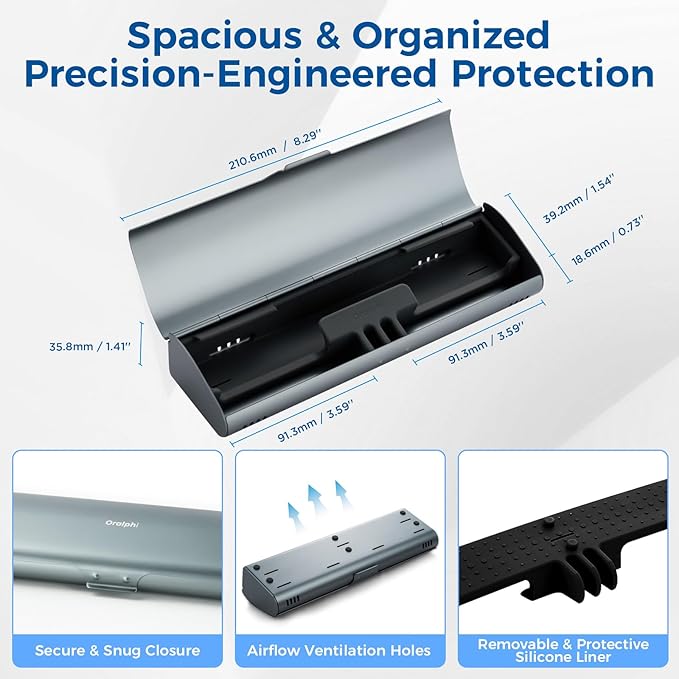 - Travel-Friendly & Secure Closure: Oralphi toothbrush travel container features a compact design 8.3 x 2.3 x 1.4’’ (L x W x H), it slides easily into backpacks and suitcases. This portable toothbrush case for traveling is ideal for daily use, outdoor, business trips, and camping adventures. Unlike frustrating zipper cases that jam, our easy-press closure with reinforced hinges and a secure latch prevents accidental openings, reliably protecting your contents even on bumpy journeys.