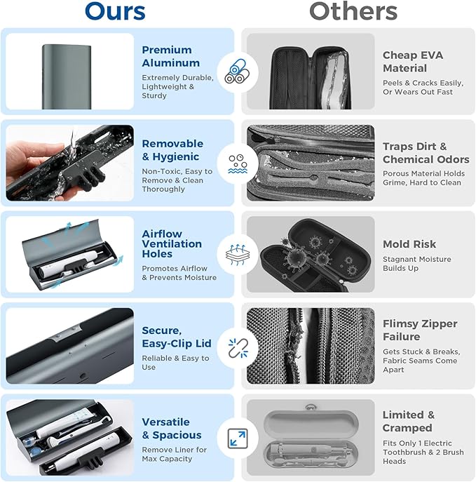 - Durable Aluminum Toothbrush Case: Made from rust-proof aluminum alloy, this durable metal electric toothbrush holder is both lightweight and built to last. And it outperforms flimsy EVA/plastic holders that peel, crack, and have glued liners that fall apart. It feels solid and looks sleek, with a soft silicone liner that safely cradles your electric toothbrush handle and two brush heads, no shaking, no scratches, no worries. Keep your electric toothbrush well-protected during your travels.