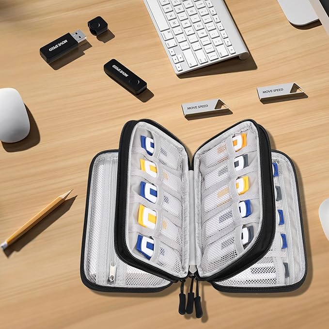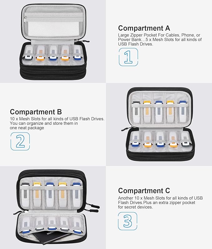 - Provide Reliable Protection: This usb flash drive organizer is made of high-quality canvas fabric. Shockproof Plastic Bone outside & Soft Sponge Lining inside offer the USB Drive storage organizer great buffer. The Thumb Drive Holder Organizer is water-repellent and also possesses interior padded cushioning for protecting your gadgets from accidental bumps, drop impacts, and scratches, durable zipper design prevents your flash drives falling out.