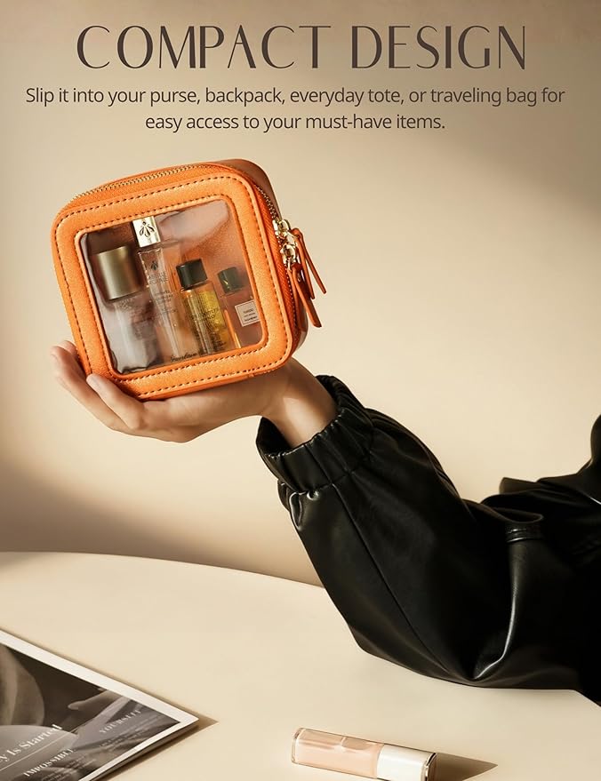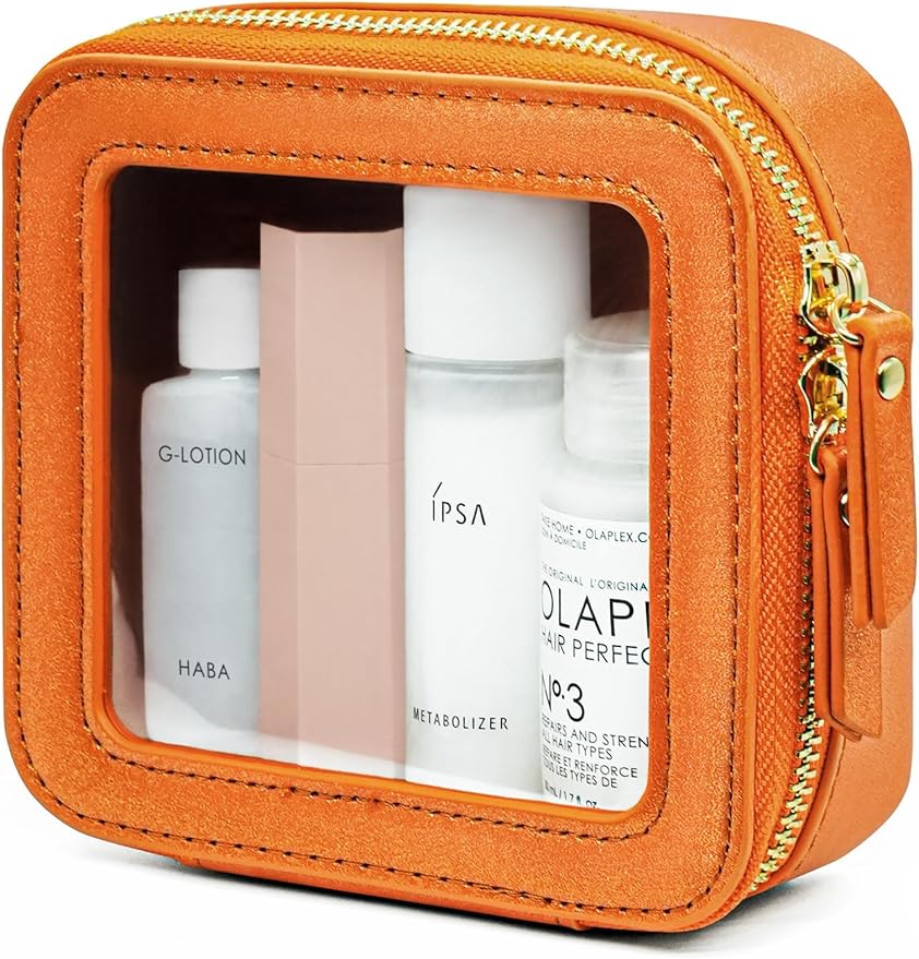- [Premium Material and Durability] – The clear small cosmetic case, both the exterior and interior, is crafted from high-grade shimmer organe faux leather, which is highly scratch resistant, durable and exceptionally easy to keep clean. It features a smooth zipper for secure closure, and elegant light gold metal hardware accents, adding a luxurious and sophisticated touch to the bag's overall design.