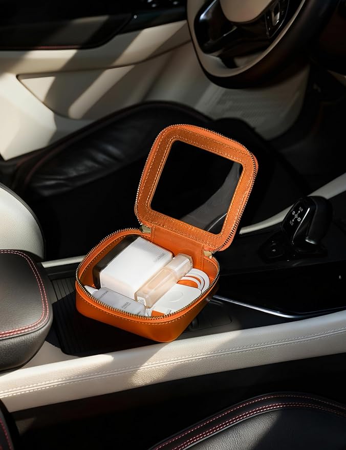 - [Mini but Mighty] – The orange mini makeup bag measures 5'' x 4.7'' x 2'' (12.7cm x 12cm x 5cm), perfect for holding daily mini essentials including lip balms, hair ties, jewelry, Air Pods, charging cords and medications. Slip it into your purse, everyday tote or car console for easy access to your must-have items.