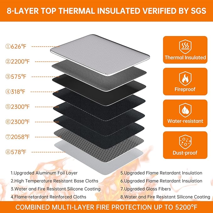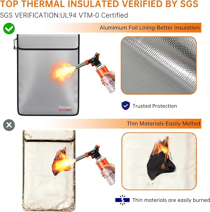 - 5200°F Fireproof Resistant Insulation Protection: DocSafe 5200°F fireproof document bags are made of 10mm premium fire-retardant, non-itchy silicone-coated fiberglass, thickened fireproof aluminum foil which can stands up against fire and passed the UL classified and SGS TEST (UL-94 VTM-0 Burning Test). The multi-layer material protection of the fireproof bag can withstand temperatures of up to 5200℉, completely protecting documents and valuables from fire damage