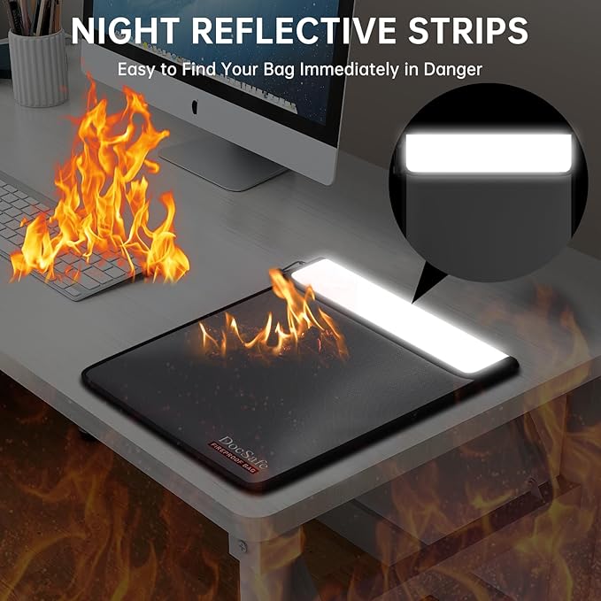 - Durable, Foldable Portable: The sealed zipper is water-resistant, capable of withstanding direct jets of water from a fire hose. The combination of a hook-and-loop flap and a zipper provides dual protection. The reflective strip ensures you can quickly locate the fireproof document bag even in total darkness. In a fire, every second counts. Our goal is to help you swiftly find and grab your most vital belongings in a crisis