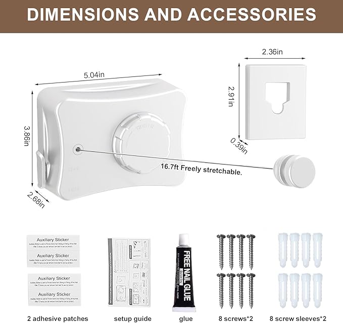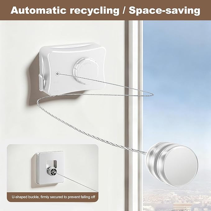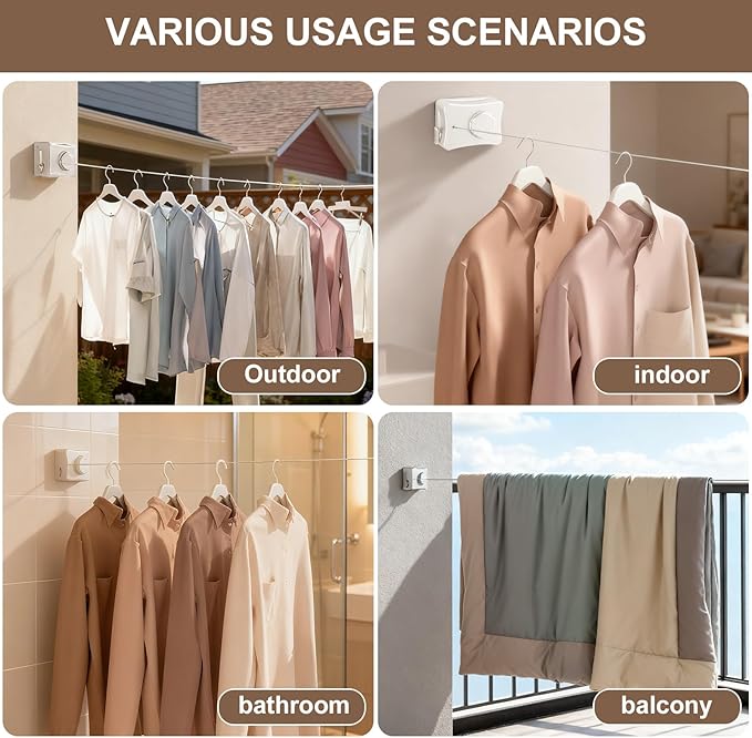 - Space-Saving & Retractable Design:When not in use, the line retracts completely into its compact ABS housing. It stays discreet and out of the way—ideal for balconies, bathrooms, RVs, and small apartments.