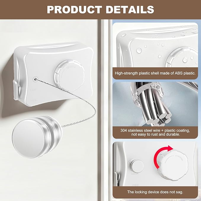 - Durable All-Weather Construction: Indoor & Outdoor Use.Made from premium ABS case, aerospace aluminum mount, and rust-proof 304 stainless steel rope, this clothesline is waterproof, sun-resistant, and built for long-lasting performance in any setting.