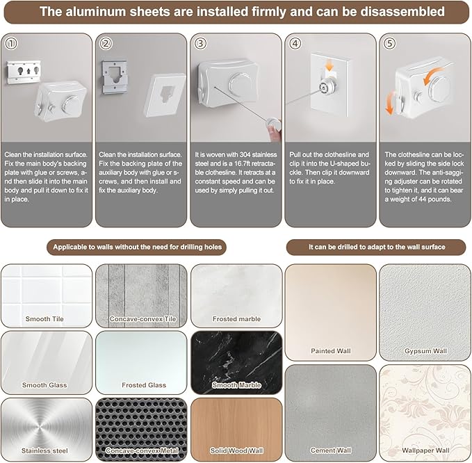 - Never Sags: Built-in Locking & Tightening System Our retractable clothesline features a unique locking device and rotary tightener. Simply pull the line, lock it, and twist to tighten—it stays perfectly taut under load, preventing sagging even with heavy, wet laundry.