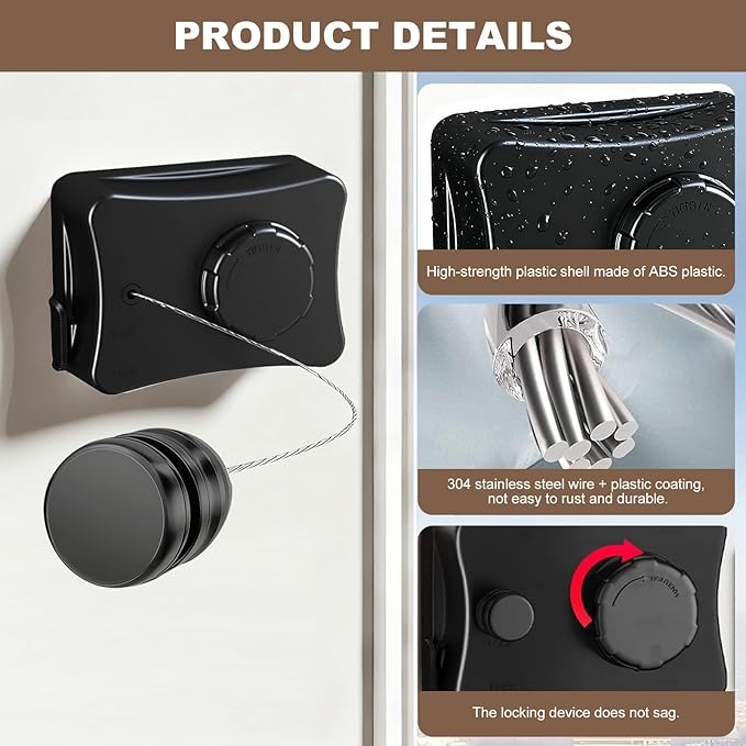 - Durable All-Weather Construction: Indoor & Outdoor Use.Made from premium ABS case, aerospace aluminum mount, and rust-proof 304 stainless steel rope, this clothesline is waterproof, sun-resistant, and built for long-lasting performance in any setting.