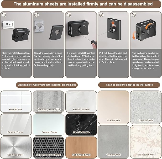 - Never Sags: Built-in Locking & Tightening System Our retractable clothesline features a unique locking device and rotary tightener. Simply pull the line, lock it, and twist to tighten—it stays perfectly taut under load, preventing sagging even with heavy, wet laundry.