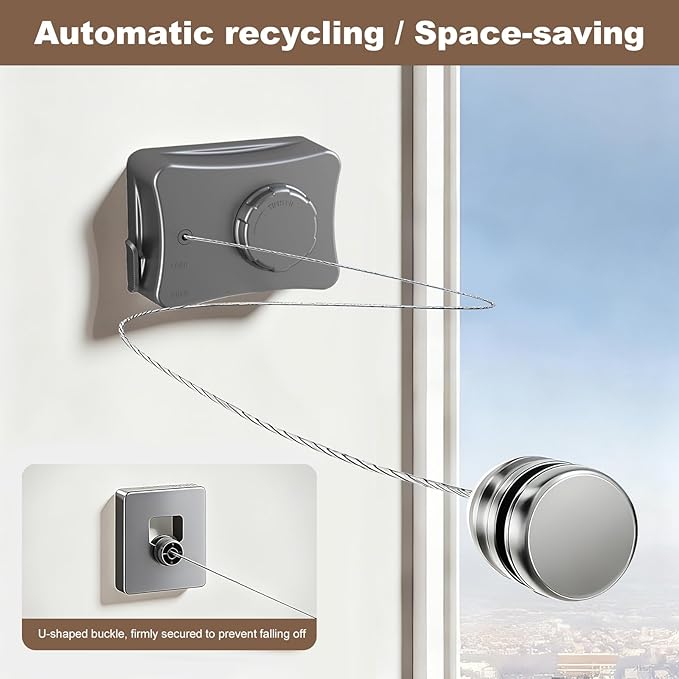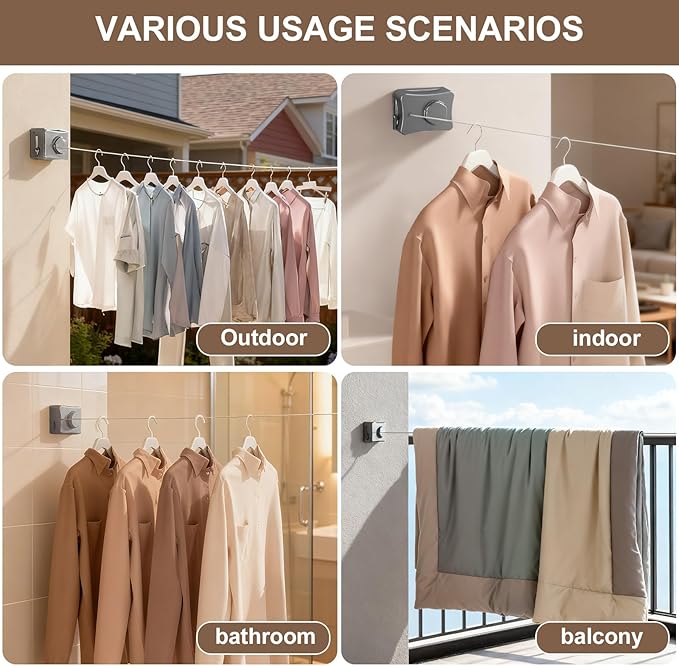 - Space-Saving & Retractable Design:When not in use, the line retracts completely into its compact ABS housing. It stays discreet and out of the way—ideal for balconies, bathrooms, RVs, and small apartments.