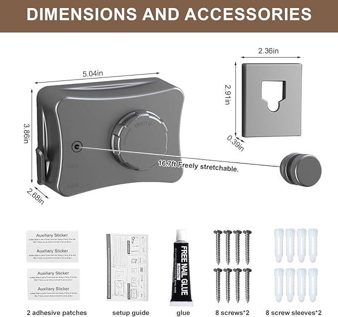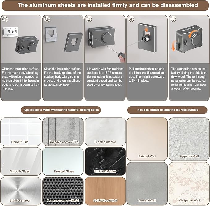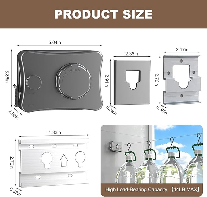 - Never Sags: Built-in Locking & Tightening System Our retractable clothesline features a unique locking device and rotary tightener. Simply pull the line, lock it, and twist to tighten—it stays perfectly taut under load, preventing sagging even with heavy, wet laundry.