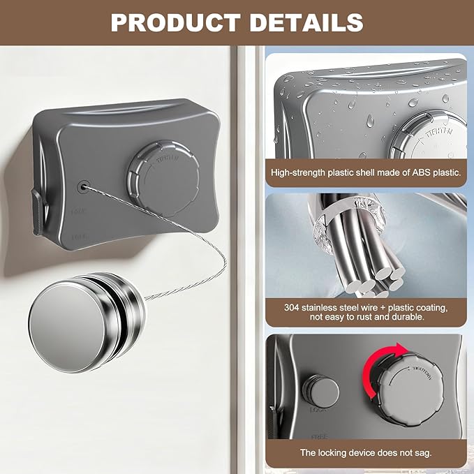 - Durable All-Weather Construction: Indoor & Outdoor Use.Made from premium ABS case, aerospace aluminum mount, and rust-proof 304 stainless steel rope, this clothesline is waterproof, sun-resistant, and built for long-lasting performance in any setting.