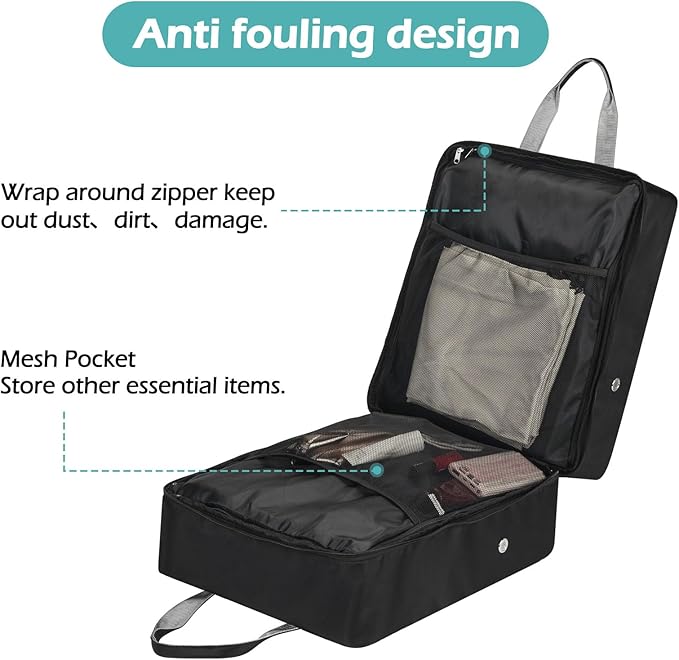 - Double Compartment Design: Two fully separated compartments prevent shoes from touching each other. Reinforced stitching and smooth dual zippers keep out dust, dirt, and damage. The mesh pocket is ideal for storing travel essentials like chargers or toiletries, while side ventilation holes promote airflow, reduce odors, and help keep your shoes dry and fresh.